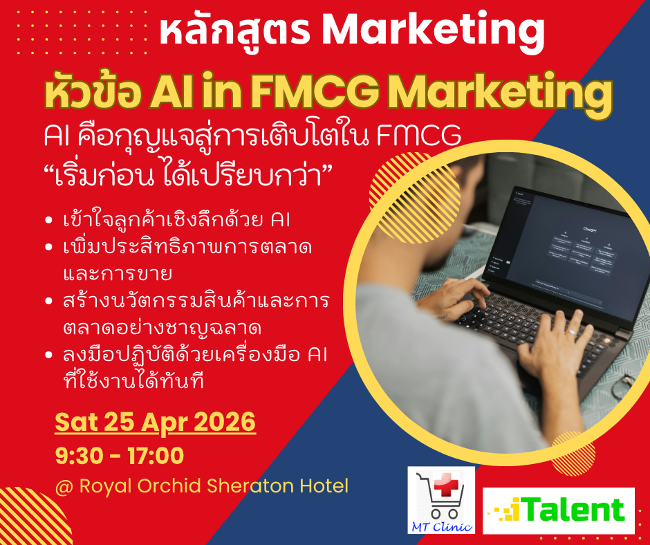 หลักสูตรนี้ถูกออกแบบมาเพื่อช่วยให้ผู้เรียนสามารถนำ AI Tools มาปรับใช้กับงาน Marketing & Trade Marketing ในอุตสาหกรรม FMCG ได้จริง ทั้งการวิเคราะห์ข้อมูลเชิงลึก การวางกลยุทธ์ โปรโมชั่น และการบริหารสินค้า รวมถึงการวาง Portfolio Strategy เพื่อสร้าง Mutual Growth ระหว่าง Supplier และ Retailer